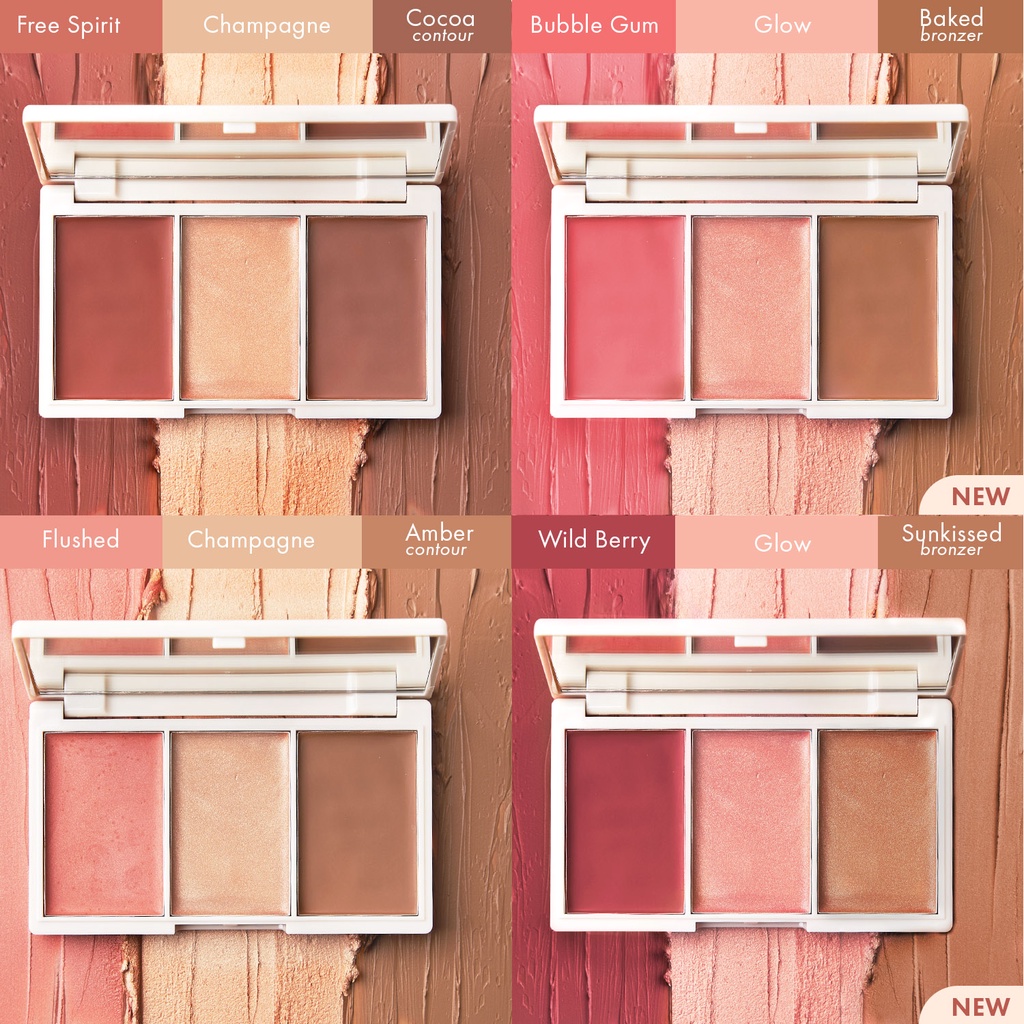 All-in-one face palette. Get your dreamiest glow yet with this ultimate face trio featuring expertly coordinated and ultra-flattering shades to give you a stunning, sculpted look: a vibrant iridescent blush, a warm matte contour, and an eye-catching champagne highlighter. Packed with life-proof pigment, the buttery, blendable creams are also infused with Vitamin E to nourish skin for that effortless, real-skin radiance.