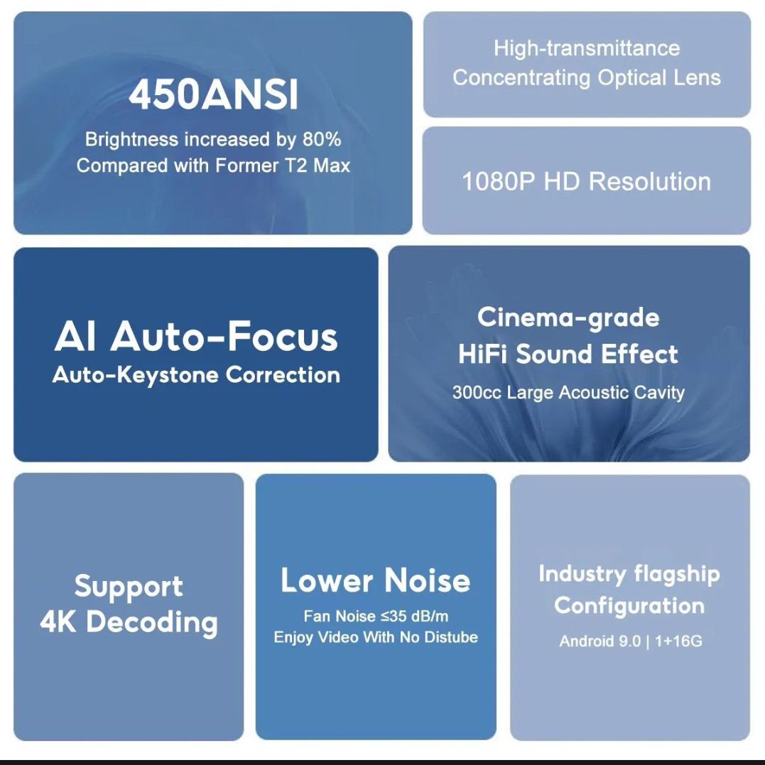 Specifications of Wanbo New T2 Max Projector 4K Decode HD Portable Android 9.0 Bluetooth Phone Mirror 3W Speaker 450ANSI for Home/Office