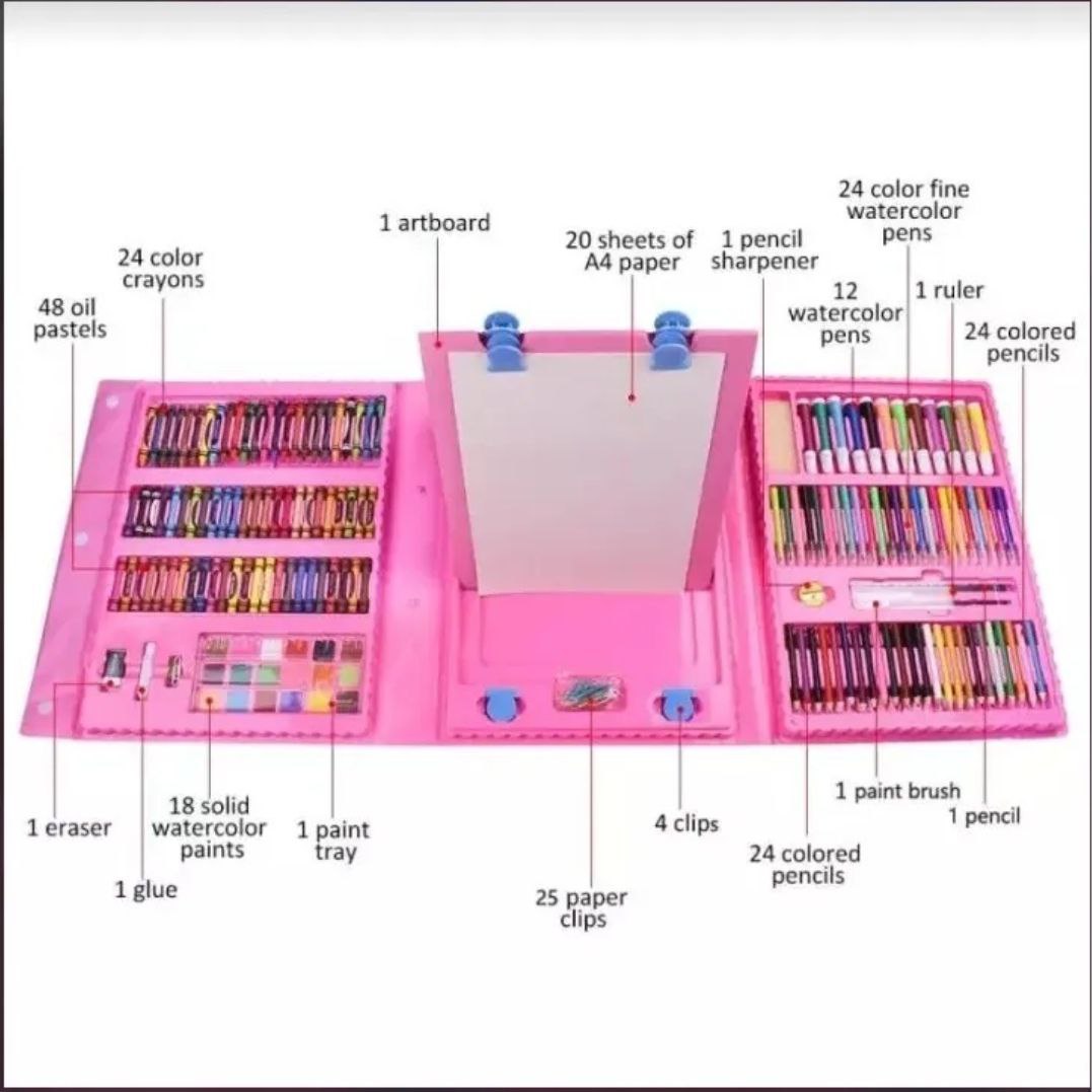 Specifications: Color: Black/Pink(optional) Item Size: 38.7 * 30 * 4cm / 15.2 * 11.8 * 1.6in Item Weight: 1200g / 42.3oz Packing List: 24 * Markers 48 * Crayons 48 * Oil Pastels 24 * Color Pencils 12 * Water-color Cakes 1 * Sharpener 1 * Pencil 1 * Eraser 1 * Brush 5 * Drawing Paper 2 * Glue 1 * Storage Case